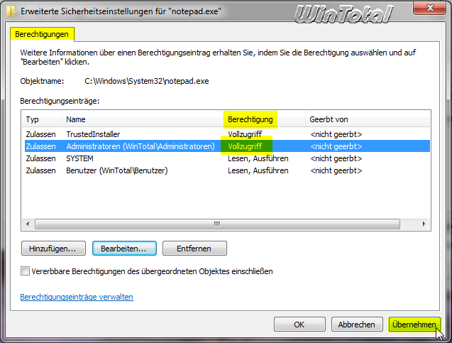 Es öffnet sich nach [OK] die Registerkarte „Berechtigungen„. Administratoren haben nun „Vollzugriff„. Klicken Sie auf [Übernehmen].