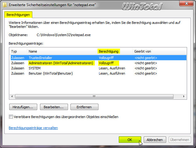 Nun sollten die Berechtigungen von der Gruppe „Administratoren“ alle Rechte haben. Es gibt nun kein Problem mehr z.B. bei UltraEdit32-Installation, die die Systemdatei notepad.exe austauscht. TrustedInstaller und Administratoren haben beide „Vollzugriff„.