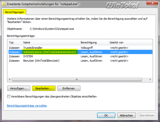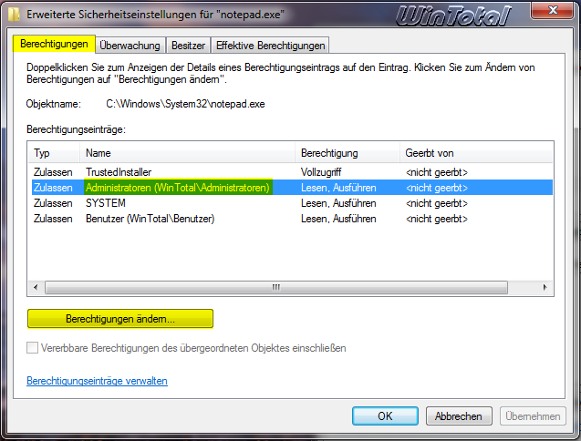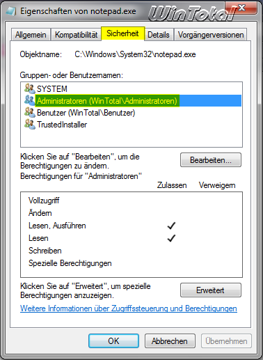 notepad.exe – Administratoren haben nur Lesen- und Ausführen-Rechte