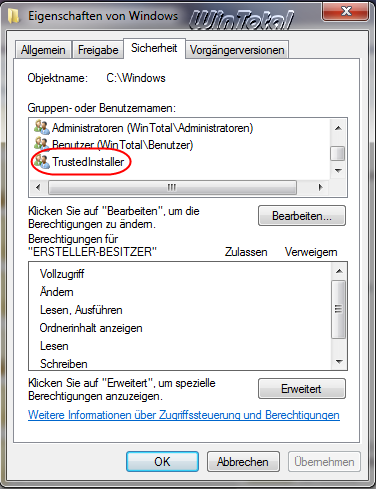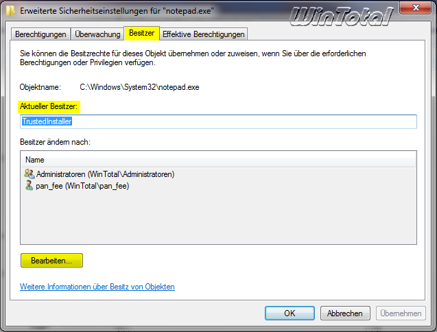 Registerkarte Besitzer auswählen – „Aktueller Besitzer“ ist TrustedInstaller – Button „Bearbeiten…“ anklicken.