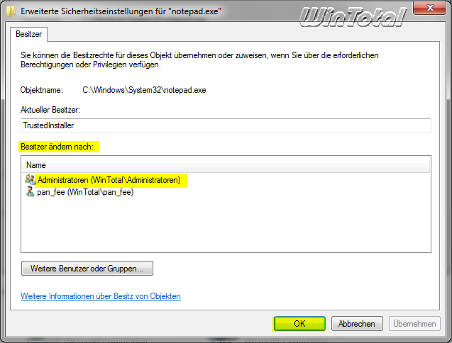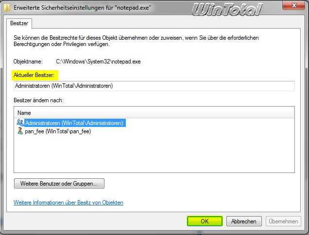 Besitzer ändern nach: Administratoren anklicken (markieren) und Button [OK].