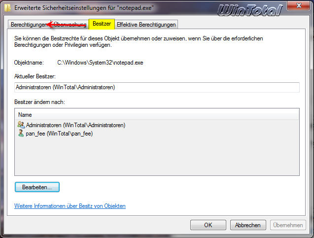 Sie sind nun wieder in der Registerkarte „Besitzer“. Wählen Sie die Registerkarte „Berechtigungen“ aus.