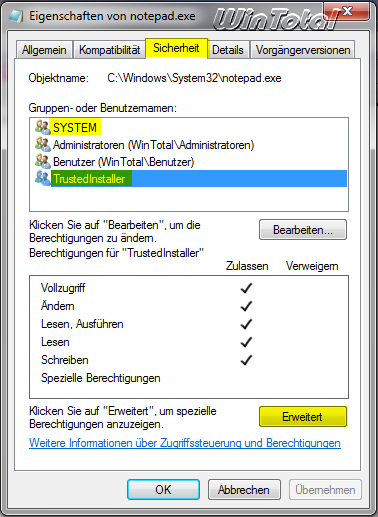 Die „Eigenschaften“ der notepad.exe aufrufen. Die Registerkarte „Sicherheit“ aufrufen – Button „Erweitert“ anklicken.