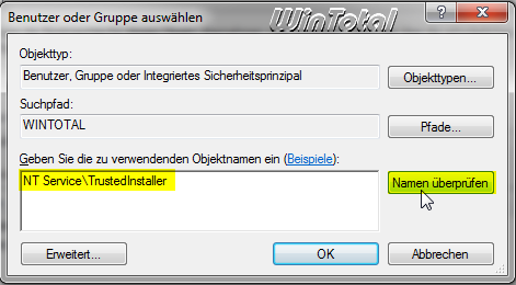 Unter „Bearbeiten“ – „Hinzufügen“ – „Geben Sie die zu verwendenden Objektnamen ein“ – NT Service\TrustedInstaller eintippen und auf „Namen überprüfen„.
