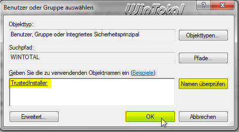 Nach [OK] ist der TrustedInstaller als Objekttyp wieder in der Auswahl.