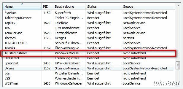 Der TrustedInstaller-Dienst von Vista Windows 7 und Windows 8, taucht in den „Sicherheitseinstellungen“ für Systemordner und Systemdateien auf. Der Dienst steht im Taskmanager unter „Dienste“, wenn er aktiv ist, aber nicht unter „Dienste“ (services.msc) in der „Verwaltung“ oder unter „Benutzerkonten“.