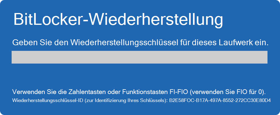 Wenn der Anwender sein Benutzerpasswort vergisst oder die Hardware ändert, muss er einen 48-stelligen Wiederherstellungsschlüssel eingeben, um wieder Zugriff zu erhalten.