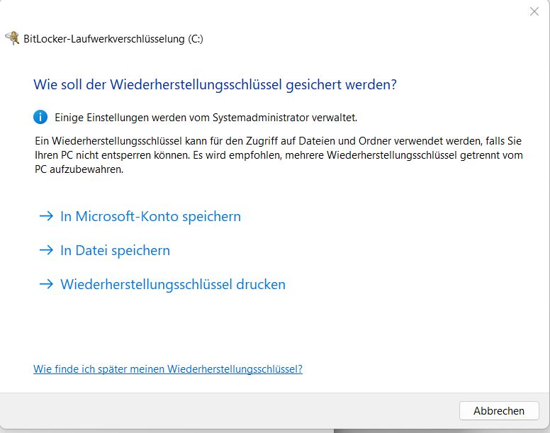 3. Der BitLocker-Wiederherstellungsschlüssel sollte umgehend gesichert werden