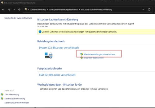 Sobald BitLocker aktiv ist, benötigen Sie den BitLocker-Wiederherstellungsschlüssel für den Notfall, da BitLocker nicht nur die Windows-Partition selbst, sondern alle Festplatten und Partitionen verschlüsselt.