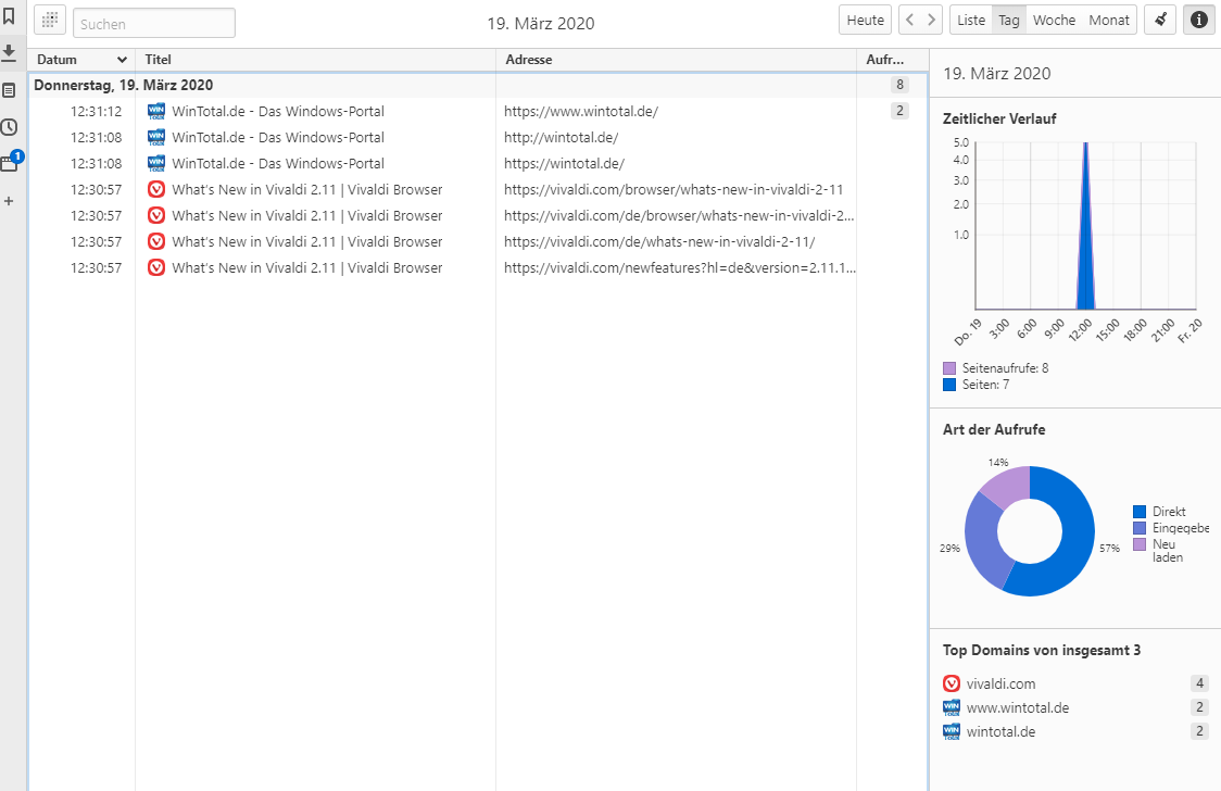 Der Browserverlauf in Vivaldi zeigt viele Detailinformationen.
