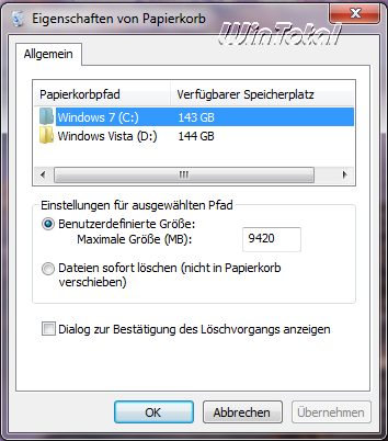 Papierkorb-Eigenschaften: $Recycle.bin unter Partition C:\ und D:\ unbenennen