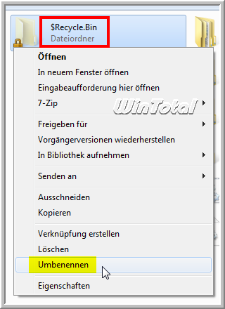 Melden Sie sich als Administrator am System an und benennen $Recycle.bin um, z.B. $Recycle.bin.old oder $Recycle.old – der Ordner liegt unter %systemdrive%. Unter Windows XP heißt der Ordner Recycler.