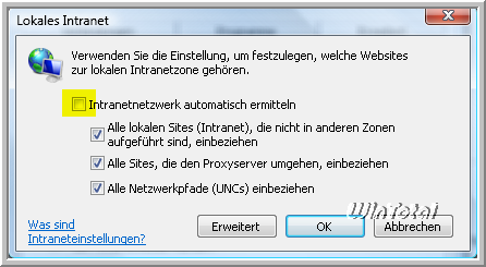 Dazu noch in den Internetoptionen -> Sicherheit -> Lokales Intranet -> „Sites“ den ersten Haken Intranetnetzwerk automatisch ermitteln entfernen.