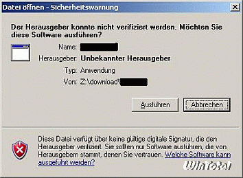 Wird beim Login eines Laufwerkes vom Server gemappt und über den Autostart eine .exe von dem Server gestartet, erscheint ein Sicherheitsfenster. Das Starten dieser Datei muss dann immer bestätigt werden.