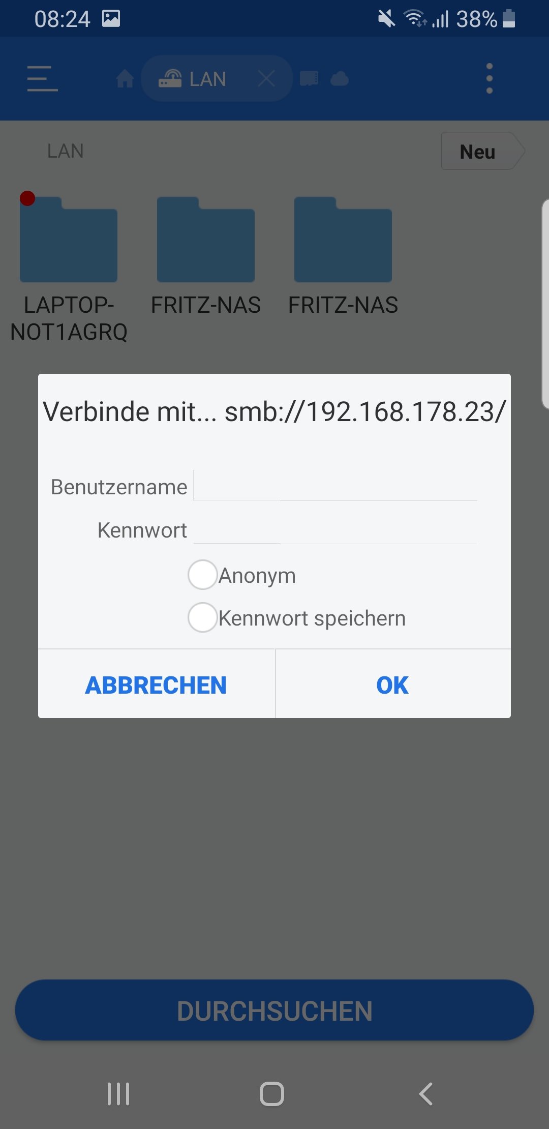 - Öffnen Sie den ES Datei Explorer auf Ihrem Smartphone und tippen Sie auf „Netzwerke -> LAN“ und danach auf den Button „Durchsuchen“.