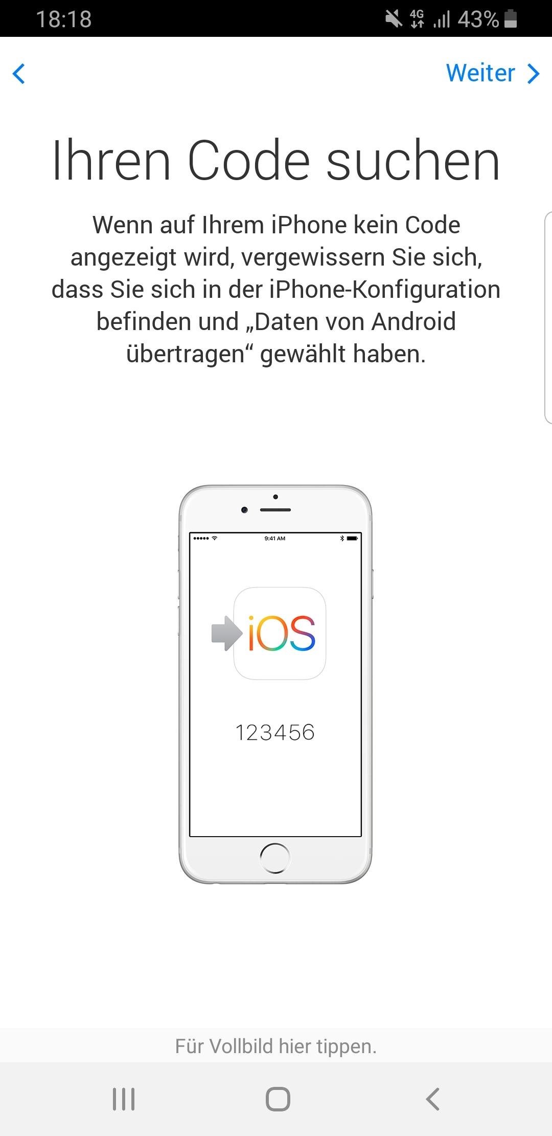 - Geben Sie den Code Ihres derzeitigen Gerätes ein und tippen Sie auf „Weiter“.