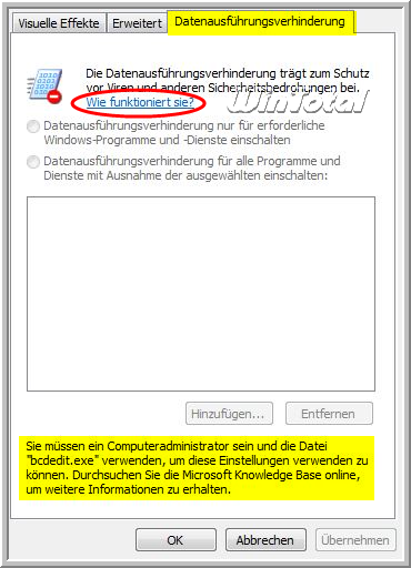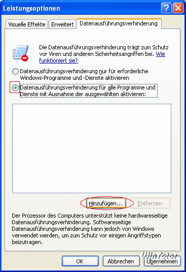 „Datenausführungsverhinderung für alle Programme und Dienste mit Ausnahme der gewählten aktivieren“