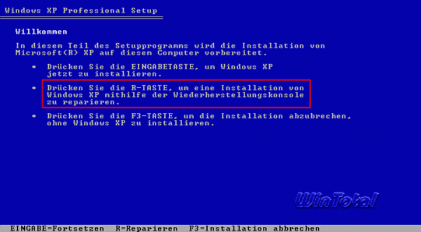 2. Wenn das Dialogfeld „Willkommen bei Setup“ angezeigt wird, drücken Sie R zum Reparieren und drücken Sie anschließend K, um die Wiederherstellungskonsole zu starten.