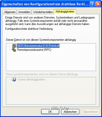 In den Eigenschaften des Dienstes „Konfigurationsfreie drahtlose Verbindung“ unter „Abhängigkeit“ sind zwei Dienste von diesen Systemkomponenten abhängig:
