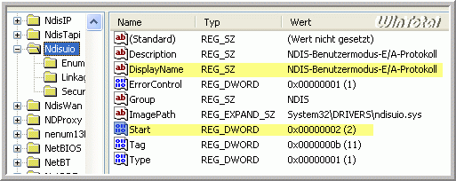 den Wert Start REG_DWORD von 3 auf 2 ändern für den Dienst „NDIS-Benutzermodus-E/A-Protokoll“.