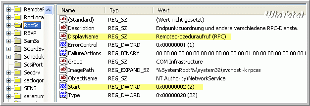 ebenfalls den Wert Start REG_DWORD kontrollieren bzw. auf 2 abändern für den Dienst „Remoteprozeduraufruf (RPC)“.