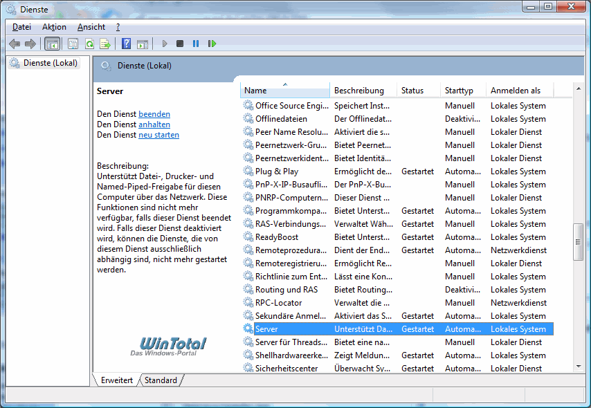 Start – Ausführen – services.msc – Der Dienst Server sollte gestartet sein.