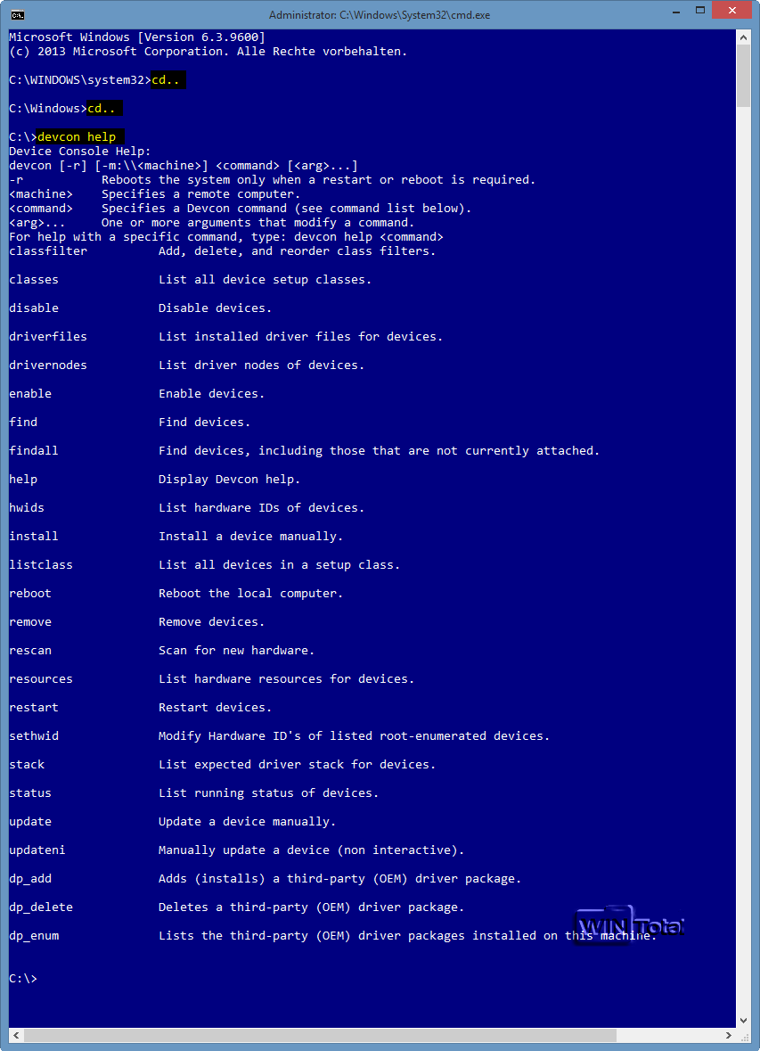 Hier geben Sie nun devcon help ein (C:\> devon help).