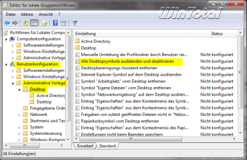 3.) Ein weiteres Szenario von 30 Sekunden Verzögerung tritt auf, wenn in der Gruppenrichtlinie „Alle Desktopsymbole ausblenden und deaktivieren“ konfiguriert wurde unter Benutzerkonfiguration – Administrative Vorlagen – Desktop„. Ändern Sie dies auf „Nicht konfiguriert“.
