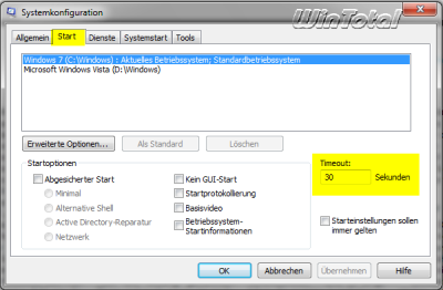 4.) Die 30-Sekunden-Pause im Bootmenü, wenn mehrere Windows-Installation auf der Platte liegen, kann ebenfalls geändert werden.