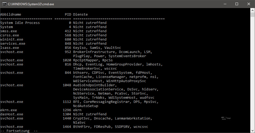 Damit man die Dienste erkennen kann, welche über die Datei SVCHOST.EXE das System nutzt, muss man den Befehl tasklist /svc | more in der Kommandozeile eingeben. Der PIPE-Strich zwischen svc und more geht über die Tastenkombination: [AltGr] + „[Pfeil_rechts_Pfeil_links]“ = |