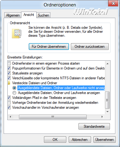 Unter Windows 7 und Windows 8 heißt die Option ein wenig anders: Ausgeblendete Dateien, Ordner oder Laufwerke nicht anzeigen