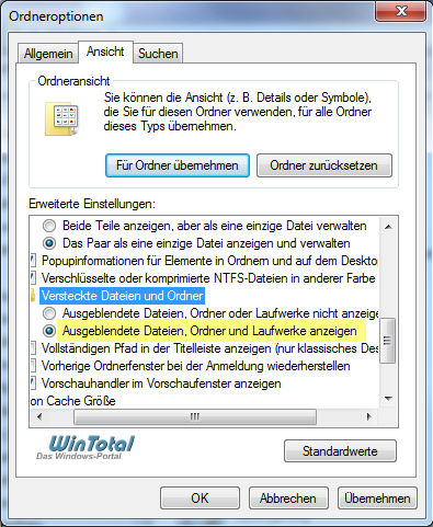 Diese Option sollte aktiviert werden, sodass auch versteckte Ordner und Dateien zu sehen sind.