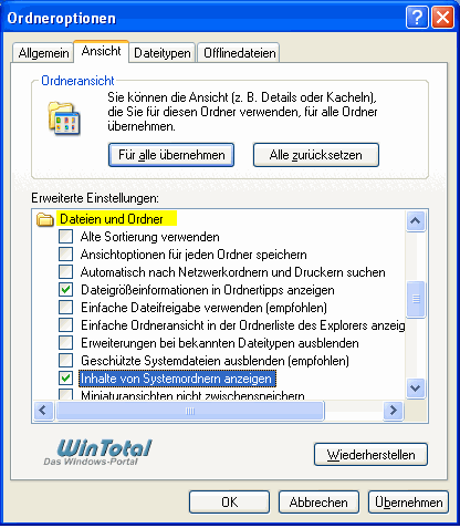 Inhalte von Systemordnern anzeigen (ist nicht mehr ab Vista enthalten)