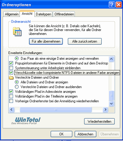 Verschlüsselte oder komprimierte NTFS-Dateien in anderer Farbe anzeigen (nur auf NTFS-Platten vorhanden)