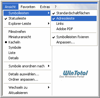 Um sich im Explorer (nicht Internet-Explorer) den Pfad, in dem man sich befindet, anzeigen zu lassen, muss die Option aktiviert werden. Wenn diese Option nicht gesetzt ist, wird nur der „Ordnername“ (Beispiel: WinTotal) des aktuellen Ordners angezeigt und nicht der komplette Pfad (Beispiel: C:\Dokumente und Einstellungen/pan_fee/Desktop/WinTotal). Dazu muss im Explorer Menü unter ANSICHT – Symbolleisten – Adressleiste aktiviert werden.