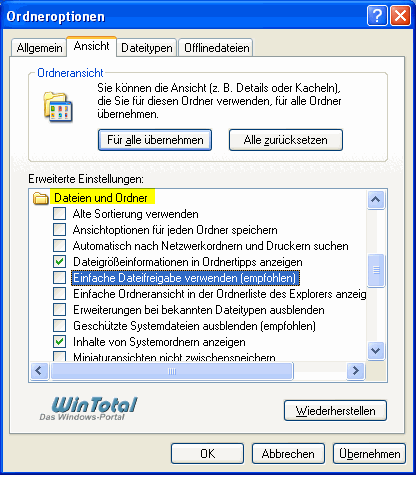 Einfache Dateifreigabe verwenden (ist nicht mehr in Vista, Win7 und Win8 enthalten, nur in der Registry – gilt nur für NTFS-Dateisystem)