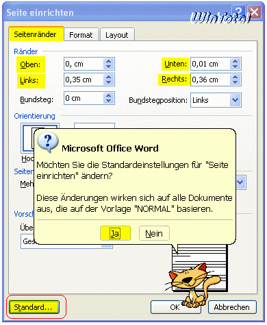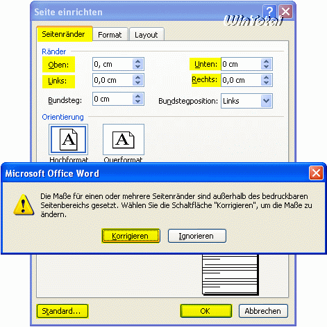 Word setzt nach der Bestätigung der [Korrektur] die kleinste Maßeinheit der Seitenränder ein. Ein Klick auf die Schaltfläche „Standard…“ speichert die Einstellungen gleich in der Normal.dot(x) für alle Dokumente.