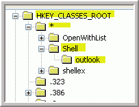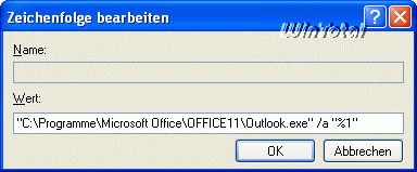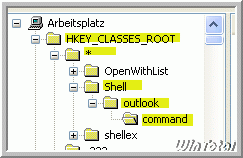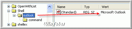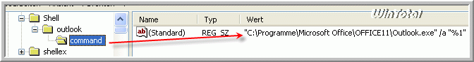 Im Schlüssel command auch bei (Standard) REG_SZ (Wert nicht gesetzt) wird der vollständige Pfad zur OUTLOOK.EXE eingetragen mit dem Startparameter „/a „%1“ am Ende des Pfades.