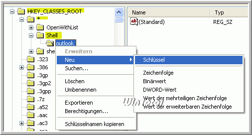 Falls „shell“ noch nicht vorhanden ist, muss dies auch über das Kontextmenü »NEU – Schlüssel« – shell – anlegt werden in der Ebene *.