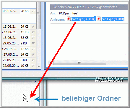Mit der gedrückten linken Maustaste die markierten Anlagen in einen beliebigen Windows-Ordner (z.B. Eigene Dateien) ziehen. Am besten das Microsoft Outlook-Fenster mit der Maus etwas verkleinern, damit man den geöffneten Ordner sieht.