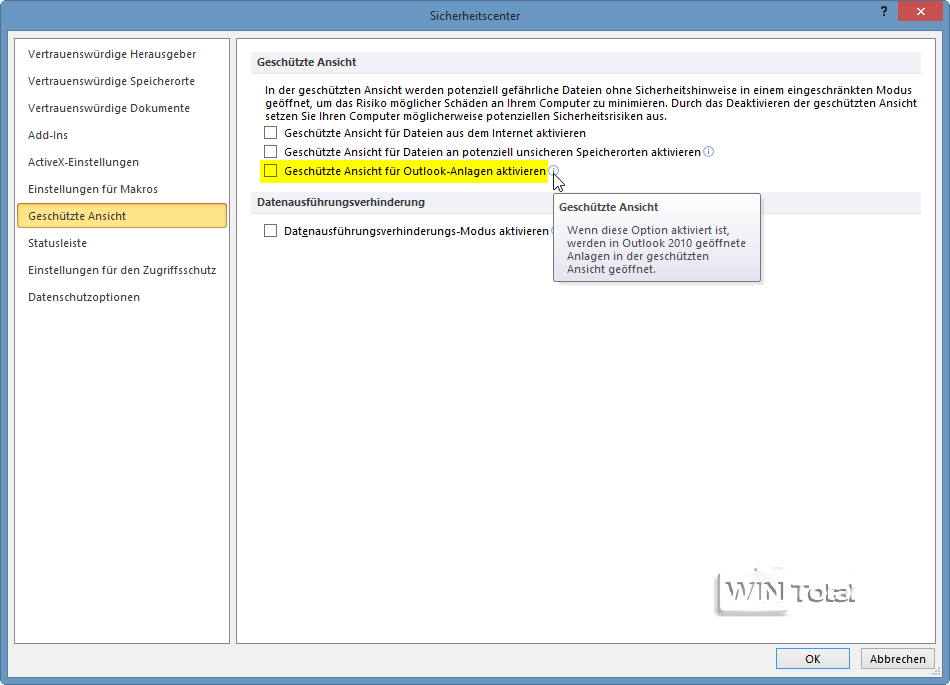 Starten Sie z.B. Word 2010/2013 mit einem neuen, leeren Dokument. Unter „Datei“ – „Optionen“ wechseln Sie zur Kategorie „Sicherheitscenter“ (2010) bzw. „Trust Center“ (2013) und klicken auf die Schaltfläche „Einstellungen für das Sicherheitscenter“ (2010) bzw. „Einstellungen für das Trust Center“ (2013). Wechseln Sie zur Kategorie „Geschützte Ansicht“ und entfernen Sie das Häkchen vor „Geschützte Ansicht für Outlook-Anlagen aktivieren„. Bestätigen Sie noch mit [OK].