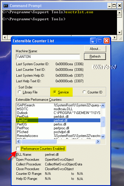 Unter „Sort Order“ „Service“ auswählen, in der Auswahlliste darunter „PerfNet“ markieren und das Häkchen unter „Performance Counters Enabled“ entfernen.
