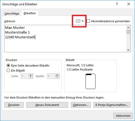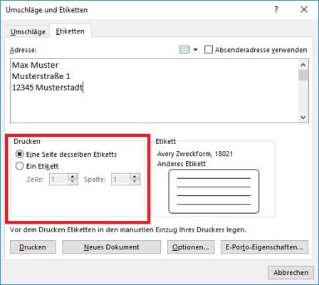 - Wählen Sie im letzten Schritt aus, ob Sie nur ein einzelnes Etikett erstellen möchten, oder gleich eine ganze Seite voller Adressen angelegt werden soll.