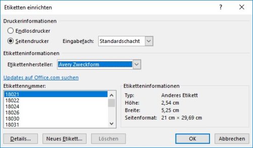- Im nächsten Schritt legen Sie das Design für Ihren Adressaufkleber fest. Klicken Sie dazu auf den Button „Optionen“. Hier können Sie beispielsweise bereits vorgefertigte Etiketten nach Modell und Hersteller auswählen oder über den Button „Neues Etikett“ eine eigene Formatvorlage definieren. Für unser Beispiel wählen wir ein Standard-Format von Avery Zweckform mit der Nummer 18021. Bestätigen Sie Ihre Eingabe mit „OK“.