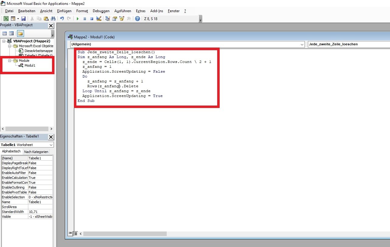 2. Jede zweite Zeile des aktiven Tabellenblattes mit VBA löschen
