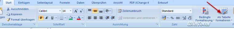 Markieren Sie zunächst die ganze Tabelle, welche formatiert werden soll. Wechseln Sie dann in der Ribbon-Oberfläche auf Als Tabelle formatieren.