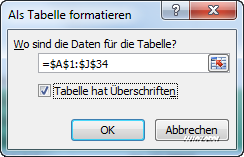 Nachdem Sie sich für ein Layout entschieden haben, erscheint ein Fenster mit dem Tabellenbereich. Aktivieren Sie hier die Option Tabelle hat Überschriften.