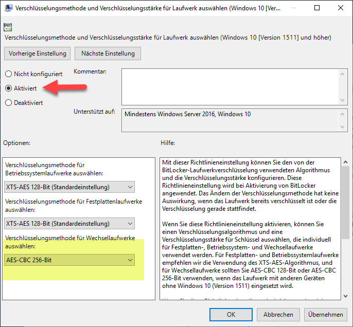 Ändern Sie hier die Richtlinie für die Verschlüsselungsmethode und Verschlüsselungsstärke für Laufwerke für Windows 10 auf AES-CBC 256 Bit für Wechsellaufwerke. Der etwas neuere XTS-Standard ist erst ab Windows 10 Version 1511 kompatibel. Die höhere Bitstärke gilt erst für Sticks, welche nach der Änderung der Richtlinie verschlüsselt werden. Wenn Sie die Gruppenrichtlinie gesetzt haben, gibt es von Windows keine Rückfrage mehr, nach welchem Modus die Verschlüsselung erfolgen soll.