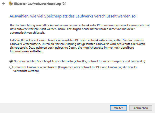 Der Assistent fragt im folgenden Schritt dann ab, ob nur der belegte oder der ganze Speicherplatz verschlüsselt werden soll. Wenn auf dem Datenträger bisher keine Daten gespeichert waren, können Sie die Verschlüsselung nur für den verwendeten Speicherplatz auswählen. Wählen Sie dagegen „Gesamtes Laufwerk verschlüsseln“, werden auch freie Speicherbereiche verschlüsselt. Der Grund liegt daran, dass in diesem Fall mit einer Forensik-Software auch aus dem gelöschten Bereich keine unverschlüsselten Datenfragmente mehr wiederhergestellt werden können.