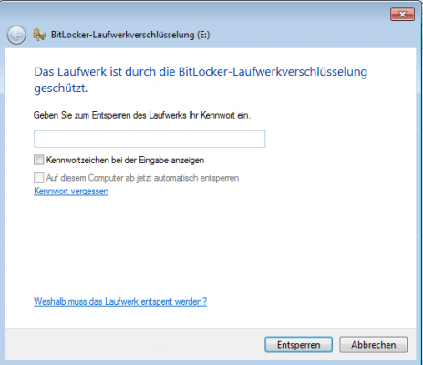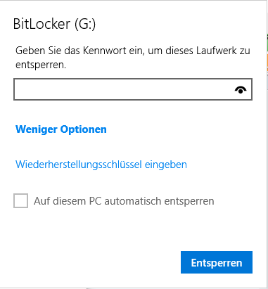 Wenn Sie nun auf die verschlüsselte externe Festplatte oder den Stick zugreifen möchten, müssen Sie diese entsperren. Dazu müssen Sie das zu Anfang festgelegte Kennwort eingeben.